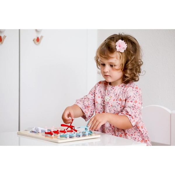 - Playful learning with wooden shoes, bright colours and laces. This promotes your child's dexterity and is fun for every child! Educational game recommended by teachers and experts.