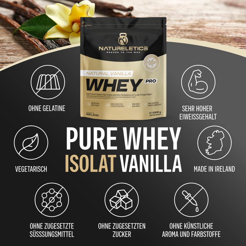 - 100% natural ingredients. If you also think that sweeteners, sugar and artificial flavours have nothing to look for in your diet, then you are in the right place. More and more professional and hobby athletes are opting against artificial food additives and sugar. So determine for yourself how sweet you like it! Naturletics Pure Natural Whey Isolate Vanilla is a natural whey protein isolate, lactose-free and with a very high protein content and with optimal amino acid profile