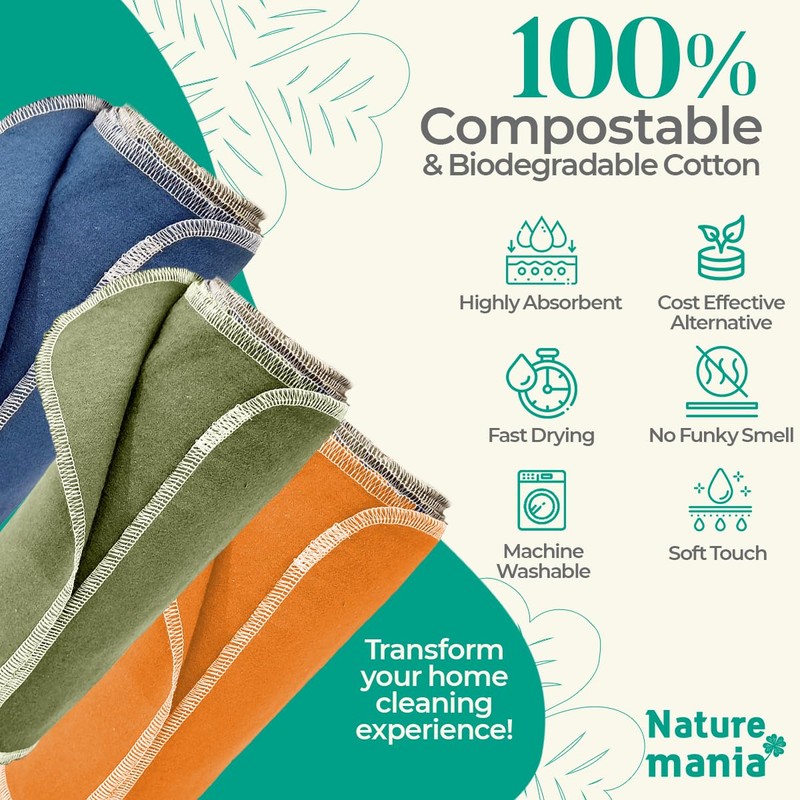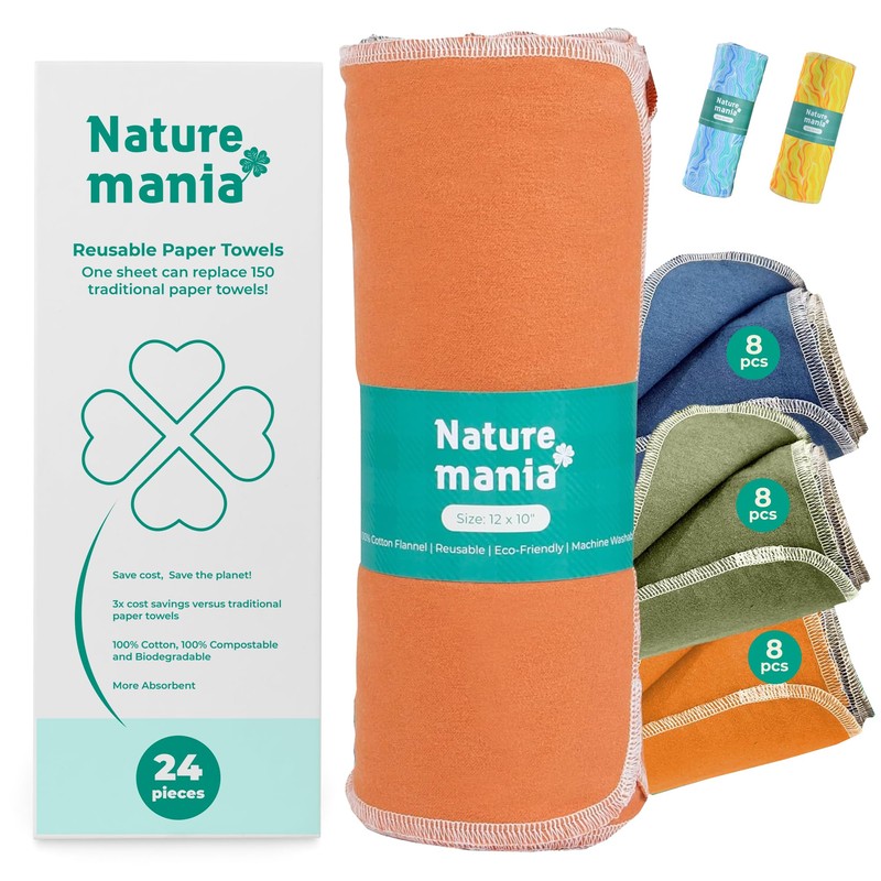 Introducing Naturemania - paper towels replacement cloths - so super-soft and absorbent they will make you forget that disposable paper towels even exist! Our eco-conscious 100% cotton flannel makes these towels durable, skin-friendly and softer than the average single-sided paper towel. The Double-sided sanding process deepens the water absorption capacity so that you don't need to use as many in your cleaning or drying tasks. And, when it comes to washing, Naturemania guarantees no shrinkage or damage—even after multiple machine washes! But where these non-paper towels really shine are in the convenience they provide – hang them, fold them or roll them up into a neat little package when you're done washing