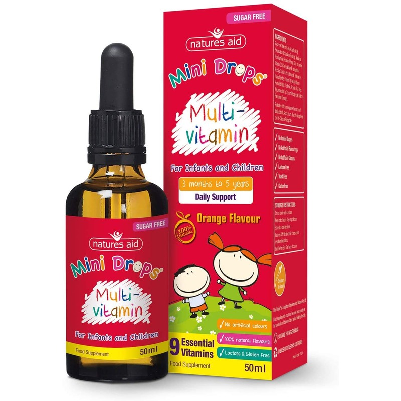 During their early years, children have a very high nutritional need and vitamins play an important role in their growth and development. Despite our best intentions many of our diets lack the nutrients we need and a multi-vitamin supplement therefore becomes an important addition to the diet Natures Aid Multivitamin Mini Drops is a carefully balanced blend of nine essential vitamins, designed for infants and children aged three months to five years. Includes vitamin B1, B2 and Niacin for normal energy yielding metabolism, vitamin D for normal bones and vitamin C for normal function of the immune system. With a pleasant natural orange flavour, these drops can be easily added to milk, formula, juice or water. Dropper included. Mini Drops was the UKs first 100 percent sugar free range of childrens supplements and the range contains no artificial flavours or colours. The liquid drops help to bypass the choking hazard presented by tablets, with none of the sugar or additives associated with gummies. Directions for use: Infants and children aged three months to five years old: Take 1 ml daily. Do not exceed the recommended intake. Suitable for vegetarians Contains NO: GM products, Artificial Colours, artificial flavours, corn, dairy, gluten, yeast, wheat, lactose, nuts, salt, soya, starch or sugar.
