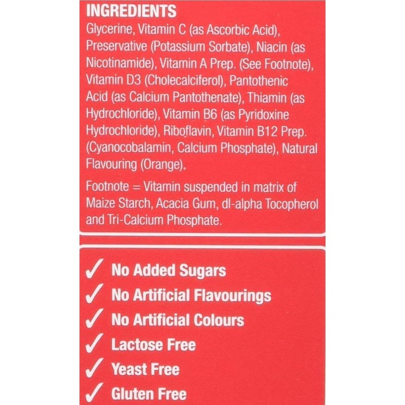 Glycerine, Preservative (Potassium Sorbate), Natural Flavouring (Orange Oil). Footnote = Vitamin Suspended In Matrix Of Maize Starch, Acacia Gum, Dl-Alpha Tocopherol And Tri-Calcium Phosphate.