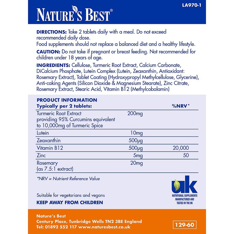 - Formula: Typically per 2 tabletsTurmeric Root Extract200mg(providing 95% Curcumins equivalent to 10,000mg of Turmeric Spice)Lutein10mgZeaxanthin500µgVitamin B12 500µgZinc5mgRosemary (as 7.5:1 extract)20mg