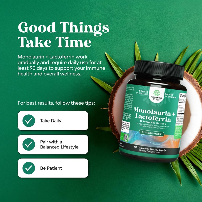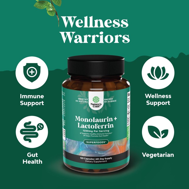 Natures Craft High Strength Lactoferrin & Monolaurin Supplement - Microbiome Digestive Health Immune Support Supplement - 250mg Lactoferrin and Monolaurin 1000mg Capsules - Vegetarian (60 Servings)