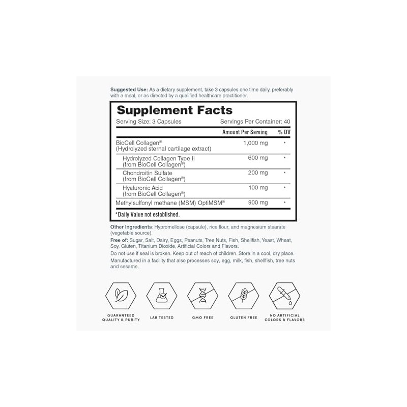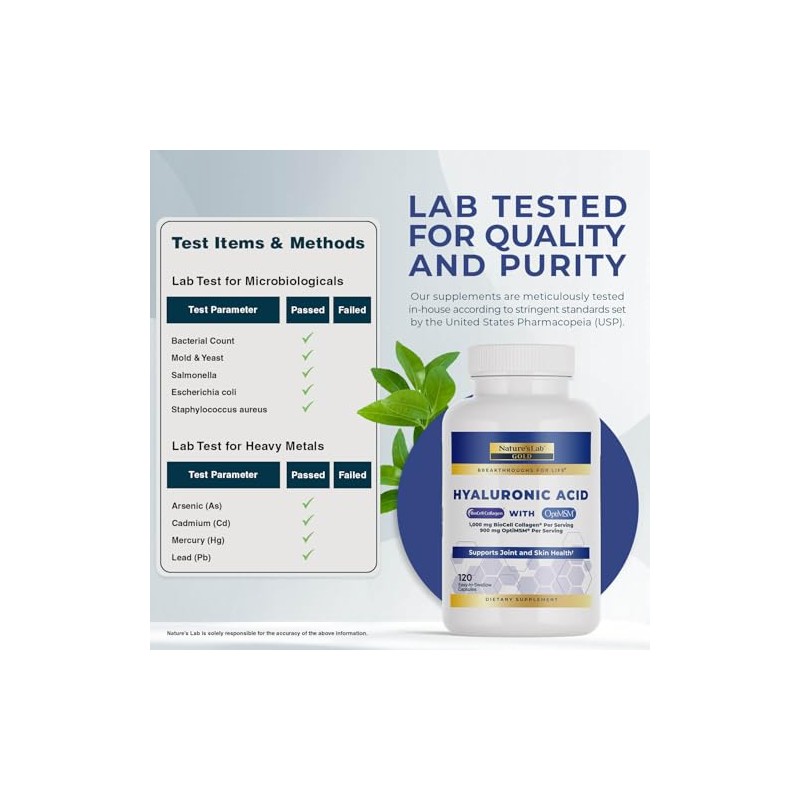 Natures Lab cido hialurnico con colgeno Biocell y MSM hidratacin de la piel, salud de las articulaciones, 120 cpsulas (suministro de 40 das)