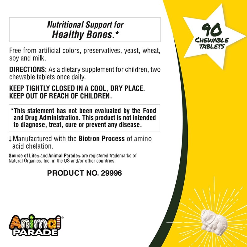 - A SPECIAL FORMULA FOR CHILDREN Each serving of two chewable animal tablets provides 250 mg of calcium and 50 mg of magnesium. This combination supports the rapid growth and active lifestyle of most children.