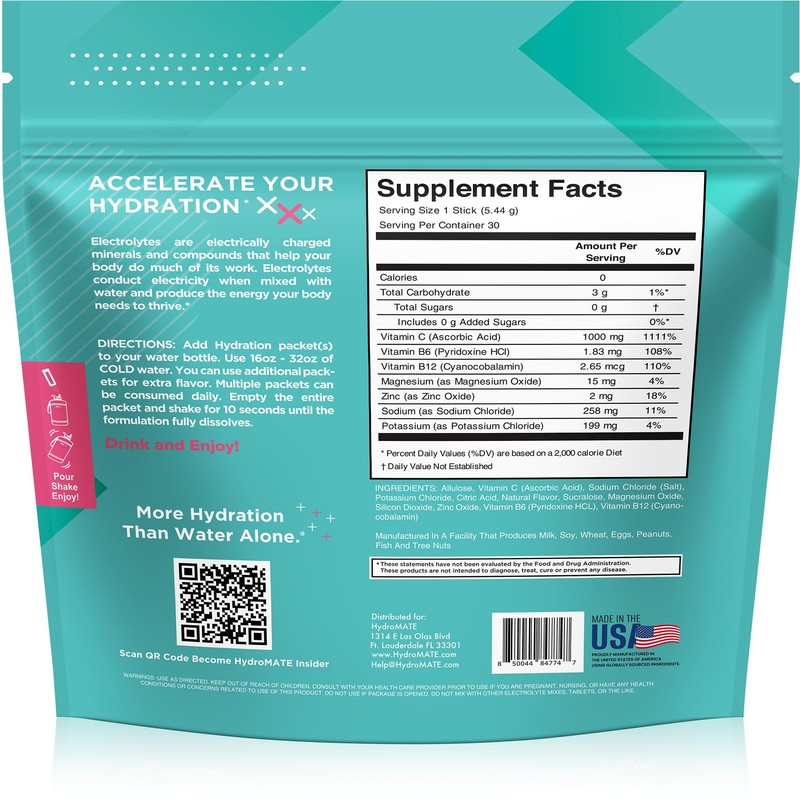 - 3x Faster Hydration than Water Alone HydroMATE Electrolyte Sticks
