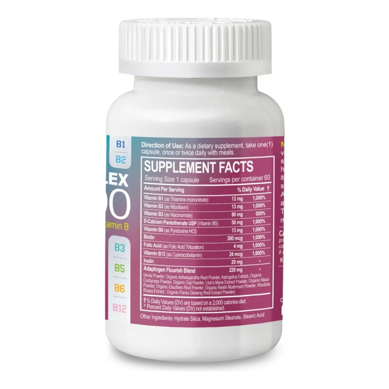 Espectro Completo de Vitaminas B y Adaptógenos: Ofrece todas las vitaminas B con beneficio adicional de adaptógenos para bienestar general.