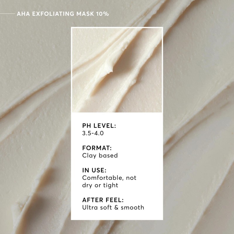 Our AHA Exfoliating Mask 10% is formulated with glycolic & lactic acids to help resurface the skin, improving the appearance of skin texture.