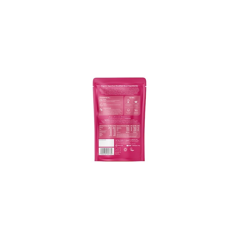 Naturya Breakfast Boost Superberries contains goldenberries, mulberries, goji berries, blueberries & acai powders. high in omega 3 fatty acids which contribute to the maintenance of normal blood cholesterol levels. Source of protein to build and maintain muscle mass.