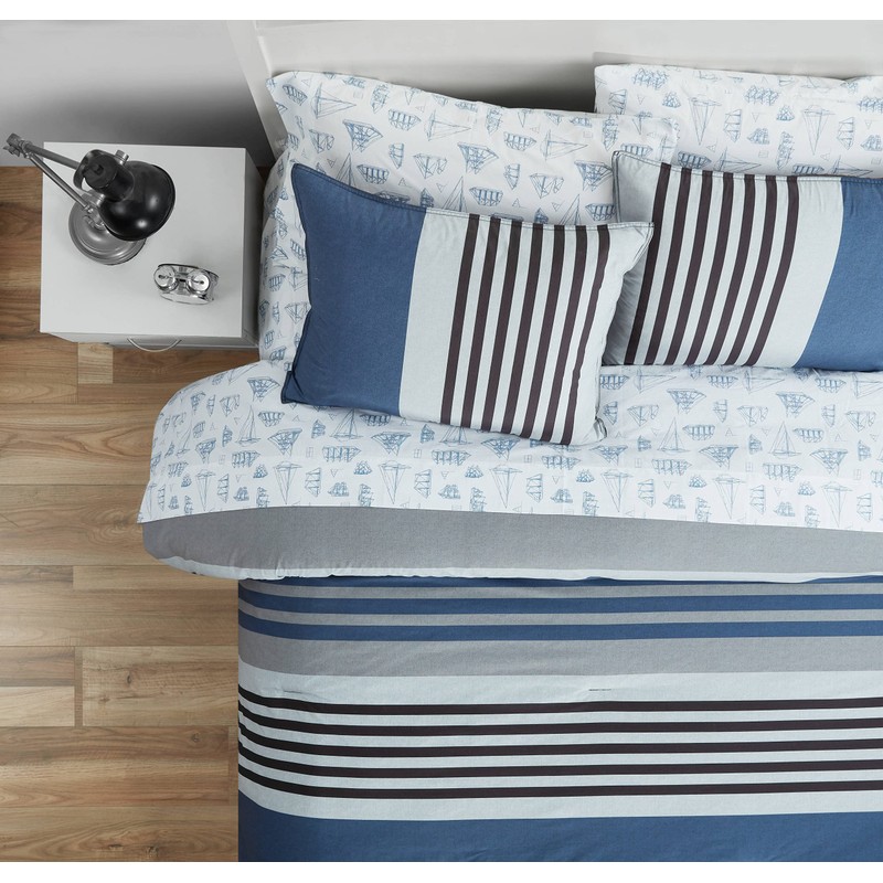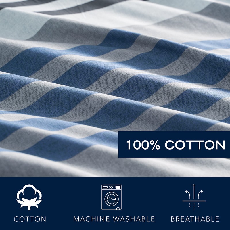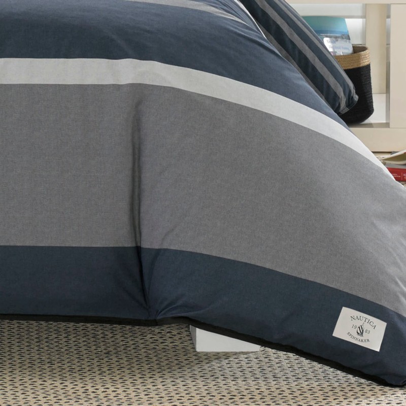 A bold engineered stripe with a printed textural effect makes a dramatic statement in a handsome palette of deep navy, charcoal, and grey on white with black accents. Engineered standard shams are a variation on the same theme, creating a dramatic focal point at the head of the bed. A woven Nautica logo patch topstitched to the comforter corner adds a signature finish to this comfortable, all cotton bedding. Layer in navy topstitched European shams as well as some of our signature accent pillows to complete the look.