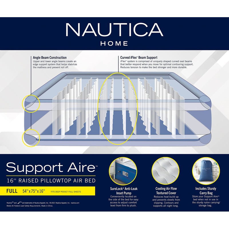Nautica Home 16" Support Aire Size Full Cooling Pillow Top with Raised Edge Support, Curved iFlex Beam Construction, Inset Powerful Pump, Puncture Resistant Vinyl, Storage Bag