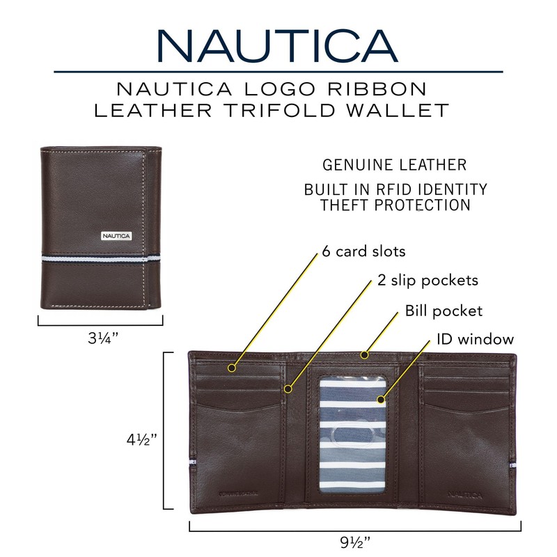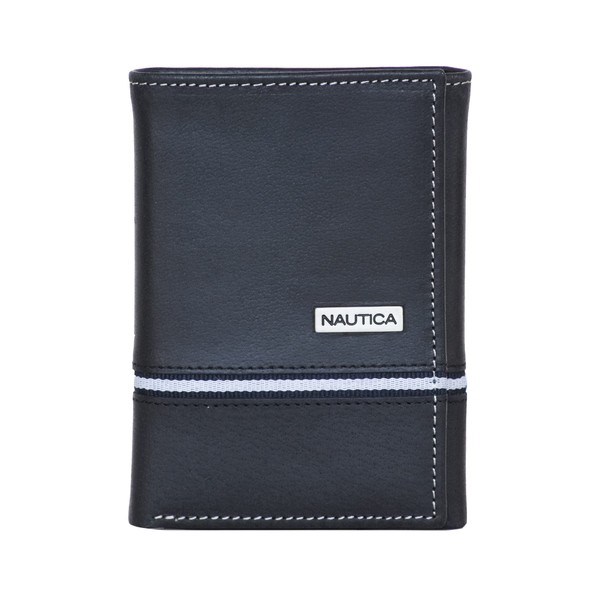 Nautica Men's Classic Leather Trifold RFID Wallet (Available in Smooth or Pebble Grain), Logo Ribbon - Black, One Size