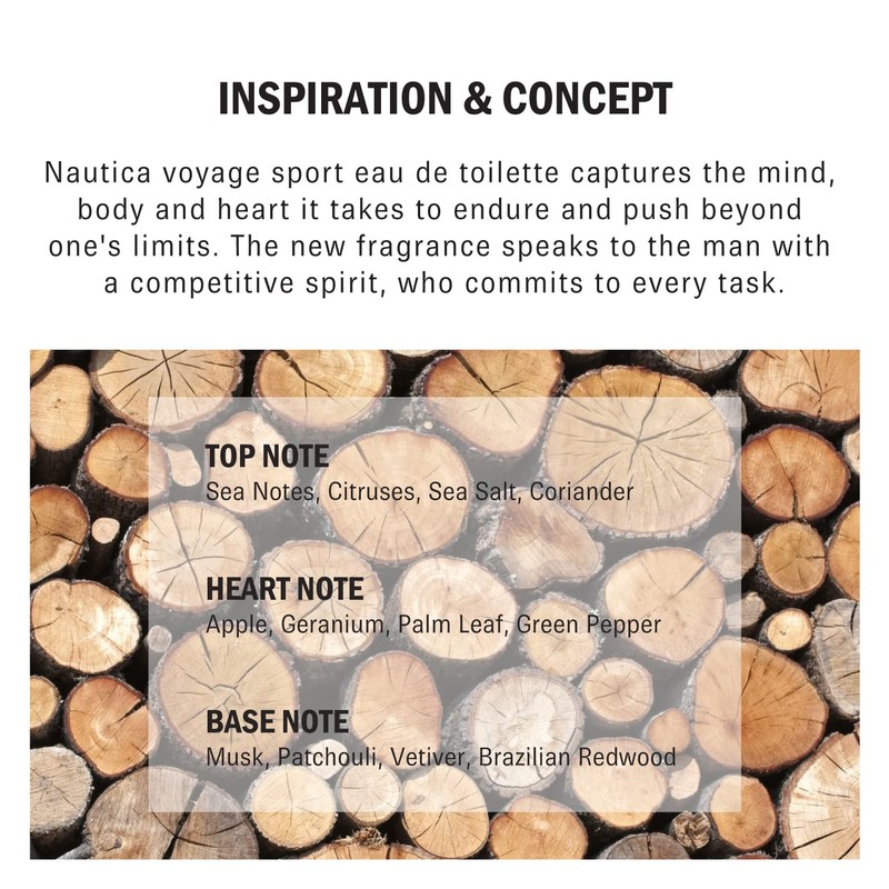 Nautica Voyage Sport captures the mind, body and heart it takes to endure and push beyond one's own limits. The new fragrance speaks to the man with a competitive spirit, who commits to every task. The fragrance opens with a Sea Spray Accord, the heart is made up of Palm Leaves and the signature dry down comes from Brazil Wood.