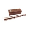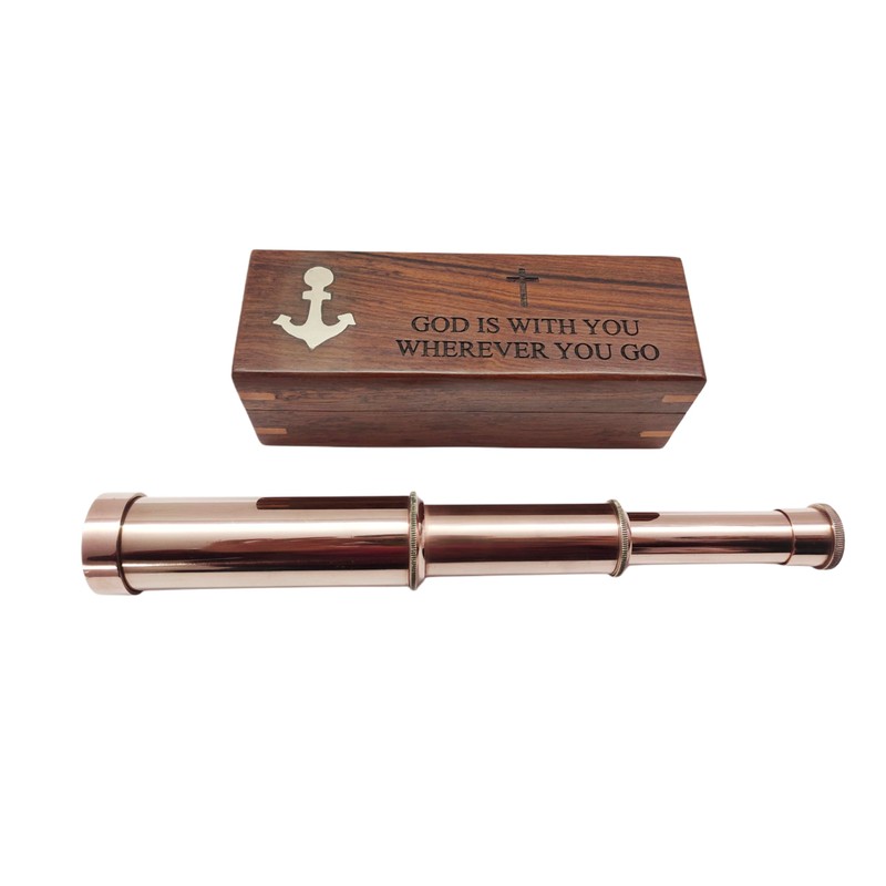 - The Nautical Brass Handheld Working Telescope is a beautifully crafted spyglass replica, perfect for adding a touch of maritime charm to any collection. Measuring 10 inches, this telescope features a classic copper finish and comes housed in a finely crafted wooden box, engraved with the inspiring message, "God is with you wherever you go." This fully functional piece offers clear magnification, making it both a practical tool and a decorative treasure. Ideal for sailor and pirate-themed home decor, it is a standout gift for nautical enthusiasts