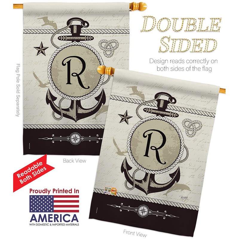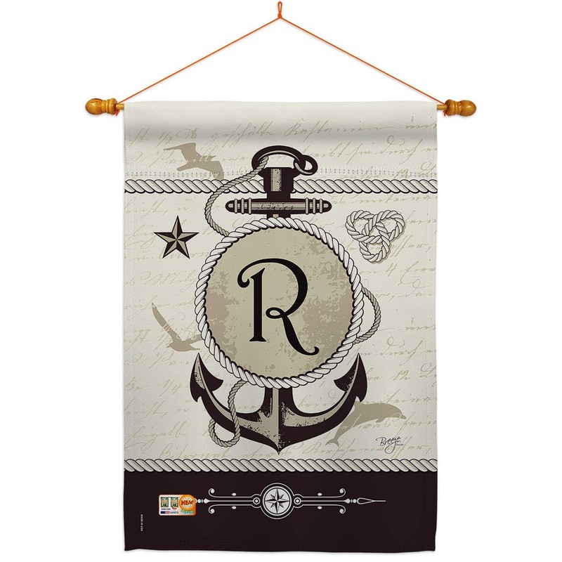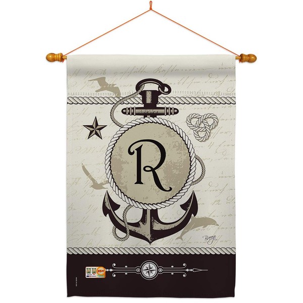 Nautical R Initial House Flag Dowel Set Monogram Coastal Anchor Sailor Sea Shells Outdoor Summer Ocean Small Decorative Gift Yard Banner Double-Sided Made In USA 28 X 40