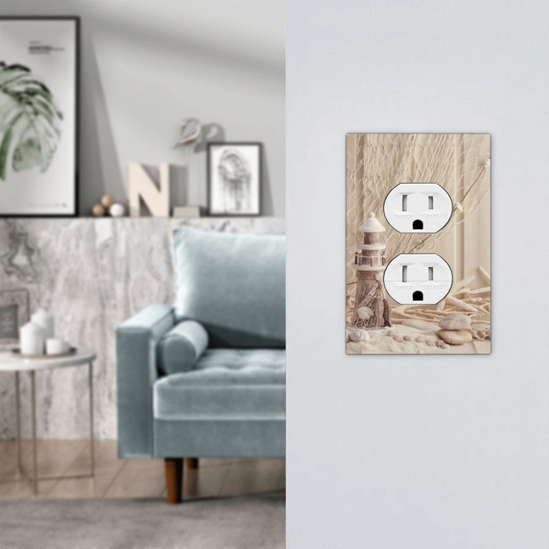Nautical Summer Ocean Seashell Starfish Lighthouse Beach Sand Stone Coastal 1 Gang Duplex Receptacle Wall Plate Jumbo Electrical Outlet Decorative Decorator Light Switch Faceplate Plug Socket Cover