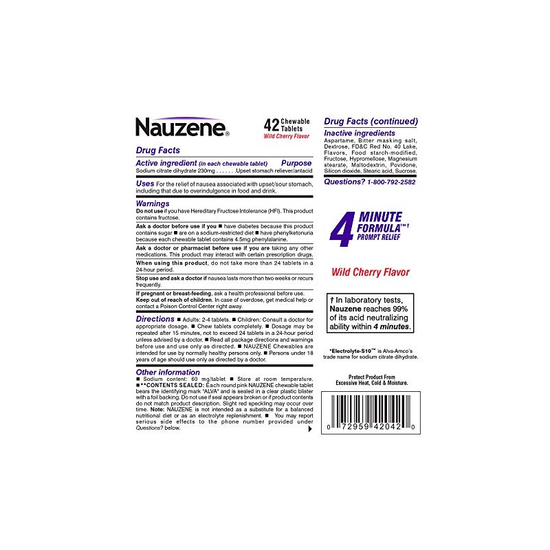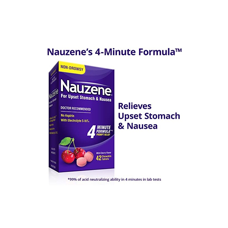 Doctor-recommended NAUZENE Chewables are a convenient upset stomach and nausea medicine. The quick dissolving chewable tablets contain no salicylates, no caffeine and no antihistamines. And they feature a delicious wild cherry flavor that has no chalky medicinal flavor or bitter aftertaste.