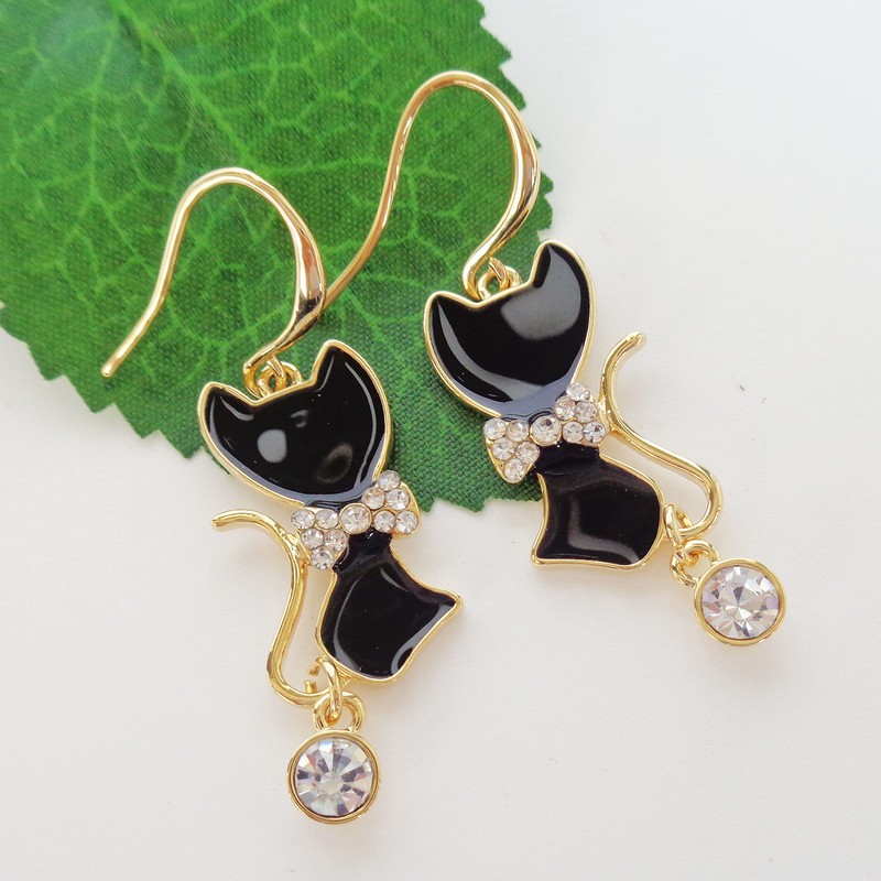 Navachi 18k Yellow Gold Plated Cut Bowknot Black Enamel Crystal Dangle Drop Cat Earrings, epoxy