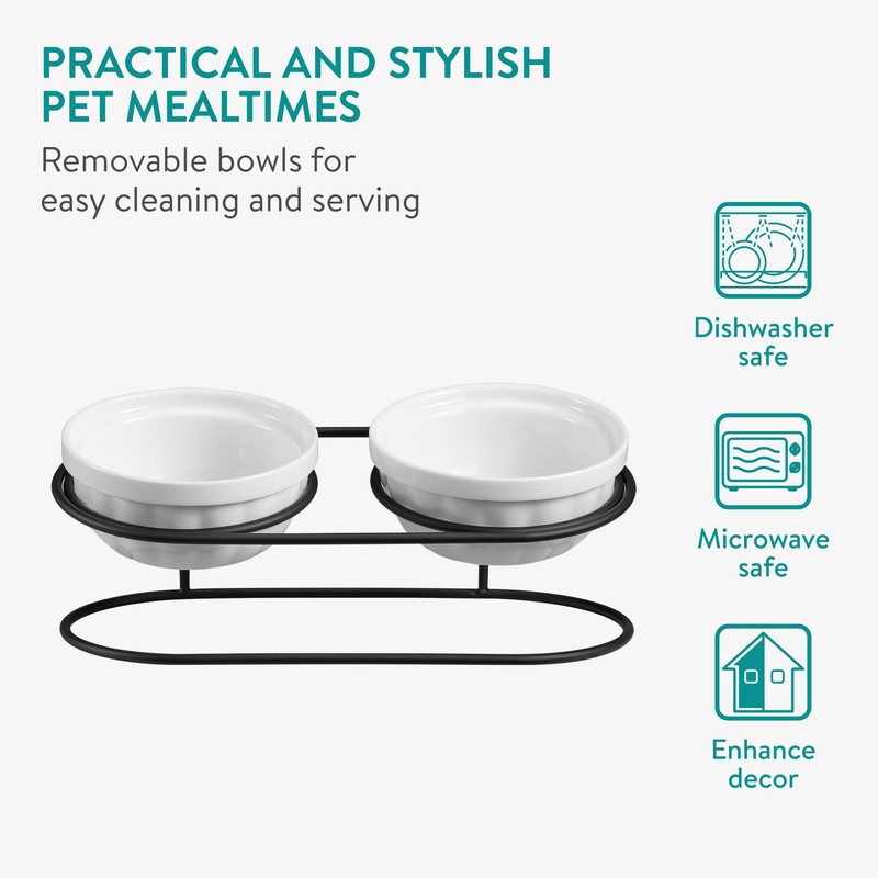 If you're looking for raised cat dishes, look no further than our ceramic bowls with a black metal stand. Our lifted cat bowl set is carefully designed to provide your furry friends with a comfortable eating and drinking experience. Each bowl is made from durable ceramic that is safe for your small cat or dog and easy to clean.