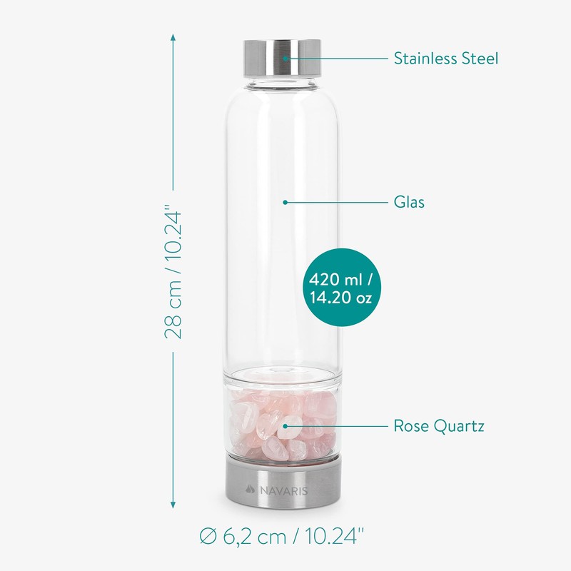 - PRODUCT DETAILS: The bottle has a 14.2oz (420ml) capacity and measures 10.2" (28cm) high x 2.4" (6.2cm) diameter. Made of glass with a stainless steel lid and base. A bag of natural rose quartz stones and neoprene pouch are supplied in the delivery.