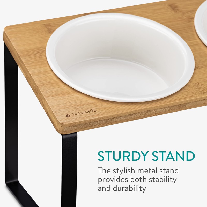 - DURABLE AND STABLE: The set of 2 stoneware pet bowls are hardwearing and easy to clean, for hassle-free feeding time after time. The stylish feeding station is a sturdy iron and bamboo construction that offers reliable strength and stability.