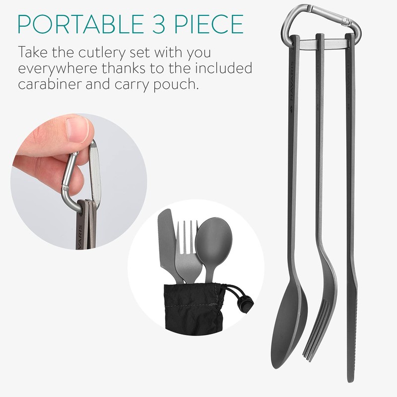 - Todo en uno: El set de 3 cubiertos incluye un mosquetón y viene en una bolsa de transporte, por lo que es ideal para llevar a campings, caminatas, picnics al aire libre, e includo al trabajo.