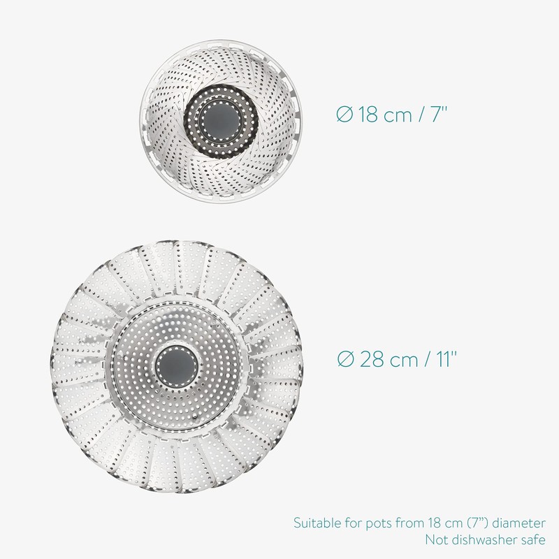 - The steamer basket is suitable for pots with a diameter of 18 cm. It is extendable and can be adjusted to different pot sizes.