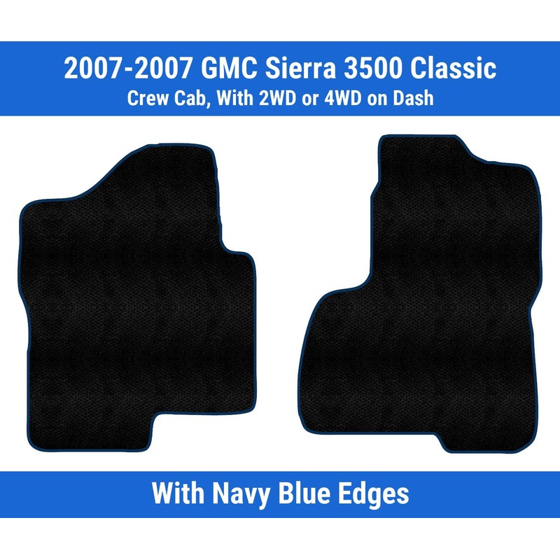 Navy Blue Edge Custom Fit Front Carpet Floor Mats, Black, Compatible with GMC Sierra 3500 Classic Crew Cab, with 2WD or 4WD on Dash 2007