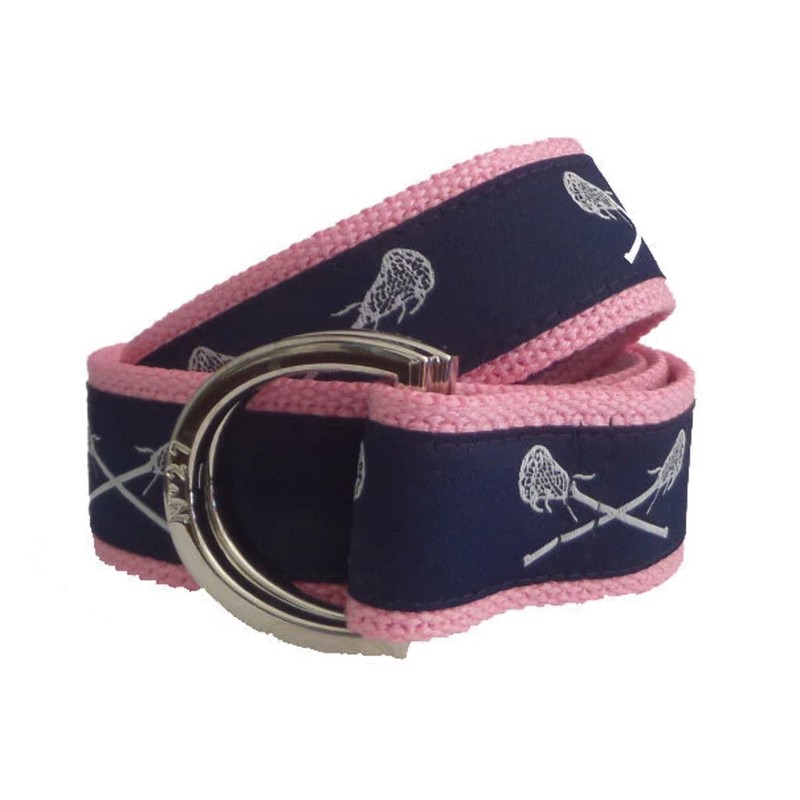 This signature lacrosse belt was designed by us and made for you! This print features our White lacrosse sticks on Nav y Ribbon...you can pair it with any webbing color to suit your needs and match your favorite team. Please let us know if you need help placing your order.