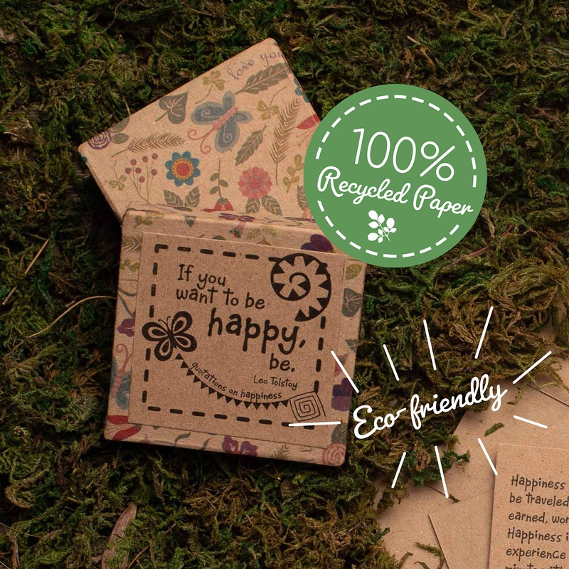 Our Box O’ Joy Mindfulness Note Cards is a small and cute box that holds 47 affirmation cards made of 100% recycled paper, making it the perfect eco-friendly cheer-up gift. Now you can spread joy even better while knowing that no trees were harmed in the process of making this box!