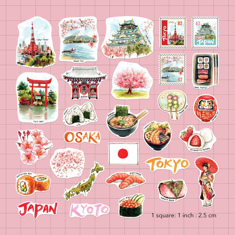 - 29 PIECES OF DIE-CUT TRAVEL STICKERS giving you an assortment of hand-painted watercolor stickers with intricate details. Most sticker sizes are 1-3 inches, while the rest are around 3.5 inches long. These cute Asian stickers are made in an excellent size to fit perfectly in your scrapbook and travel journal for memory-making. They are also great materials for making a travel vision board to plan for your next trip!