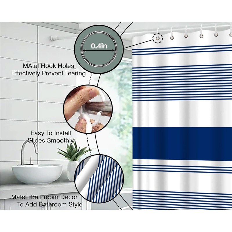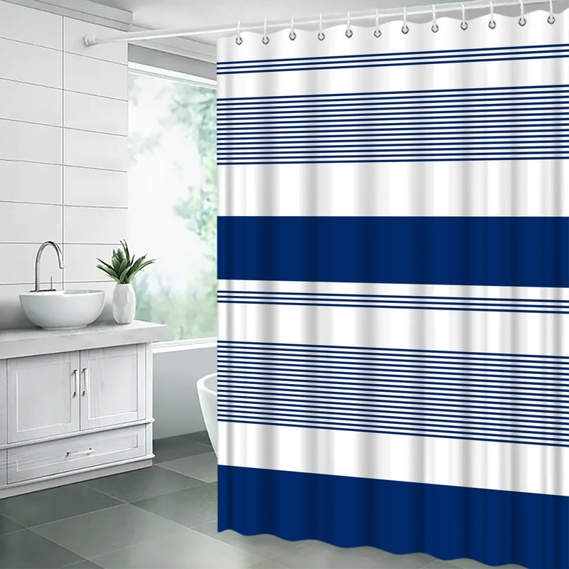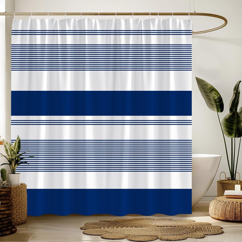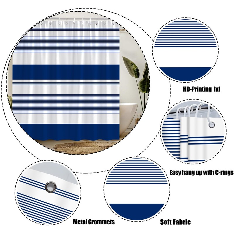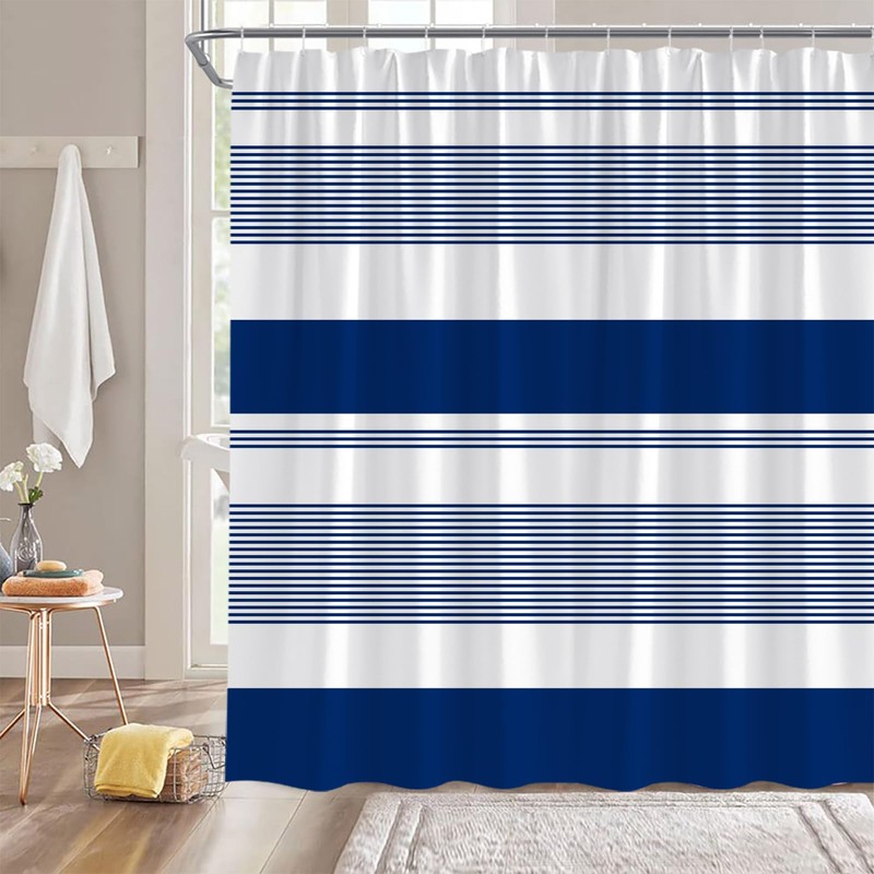 Navy Striped Shower Curtain Modern Abstract Geometric Stripes Blue White Bathroom Decor Fabric Curtain with Hooks,70" WX70 H Inches