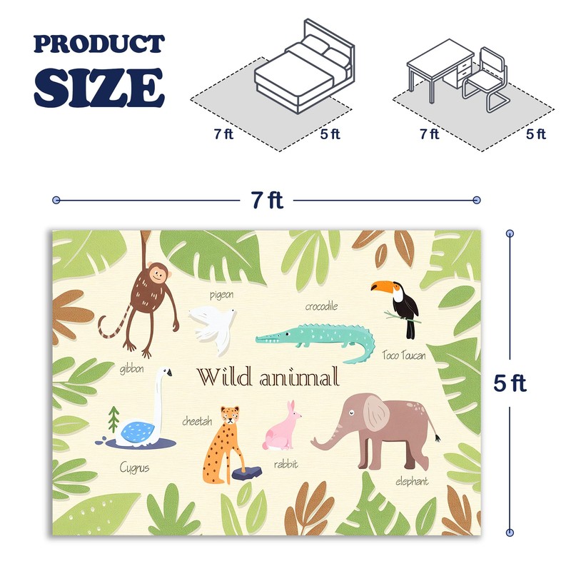 - Beautiful Design: Showcases cartoon gibbon, toucan, crocodile, cheetah, elephant & labeled names, surrounded by lush tropical leaves. Soft beige base with vibrant animal hues merges playful learning & decor, perfect for kids’ playrooms/nurseries.