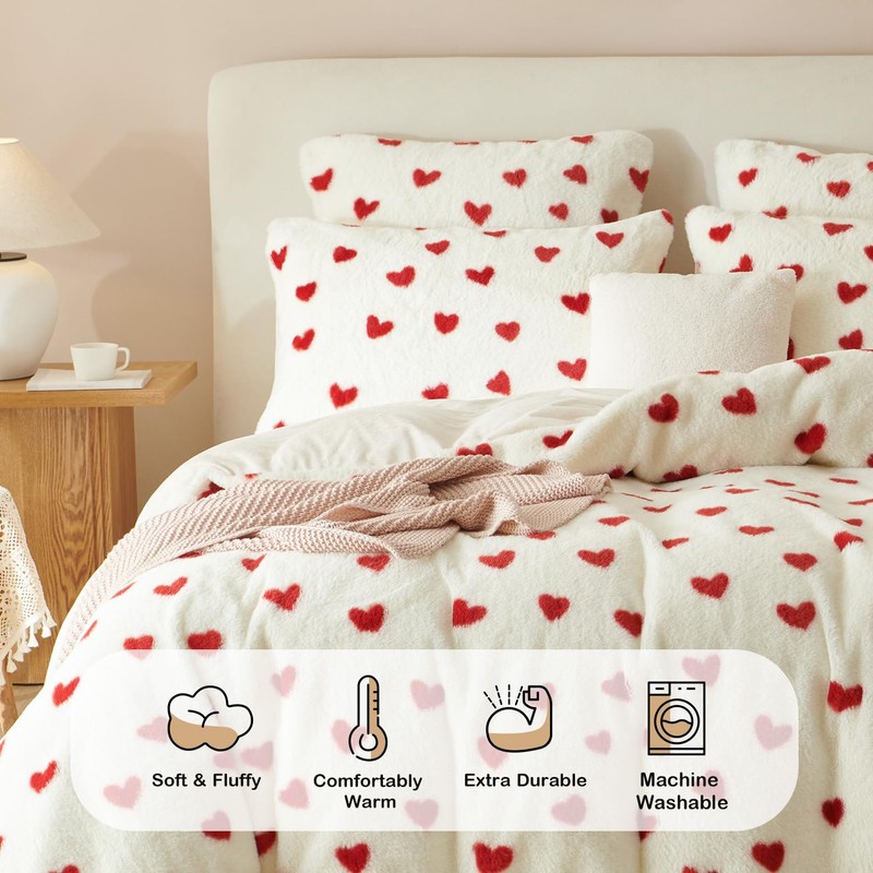 • Thoughtful Details: This red heart shaggy faux fur velvet duvet cover is designed with your comfort in mind. The delicately hidden zipper closure makes it easy to insert or remove your quilt, while the 4 strong corner ties keep it securely in place.