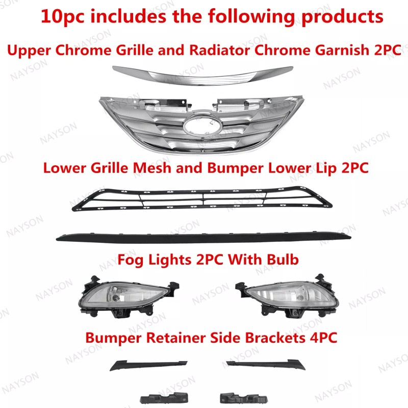 NAYSON 10PC For Sonata 2011-2014 Upper Lower Grille Fog lamps Bumper Retainer Brackets