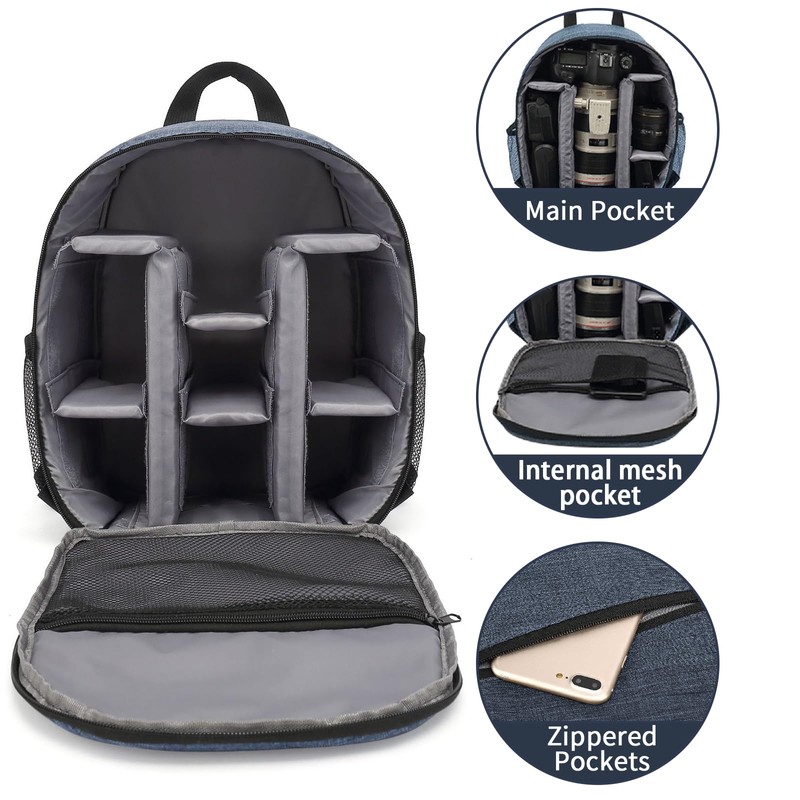 The camera compartment is crafted to accommodate camera machines and lenses, multiple sets of batteries or accessories. Side pockets and compartments are perfect for storing batteries, memory cards, cables, or personal items such as clothes, cellphones, books, and so on.