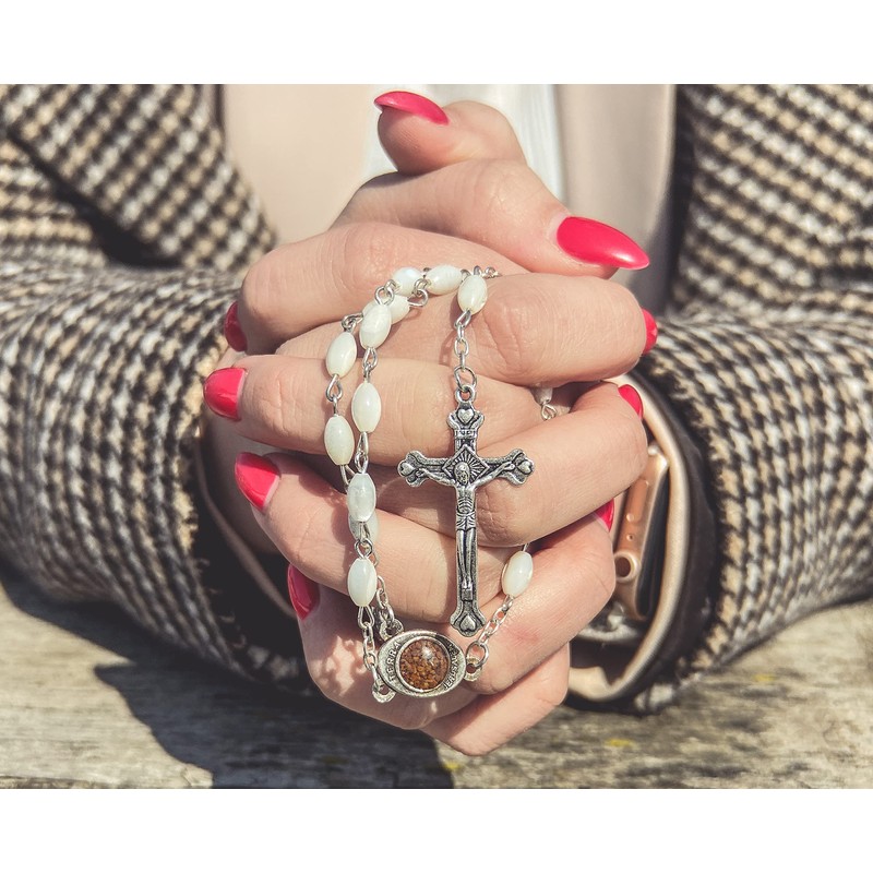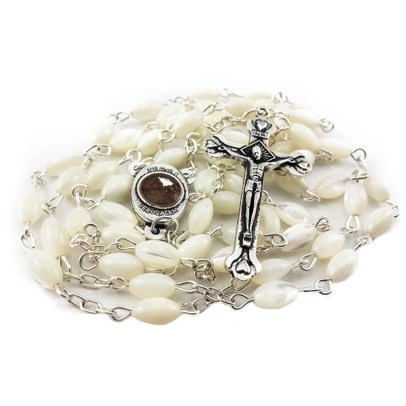 Nazareth Store Mother of Pearl Beads Rosary Natural Shell Beaded Necklace Holy Soil Medal & Cross Crucifix Bethlehem Handcrafted Chaplet