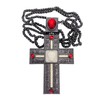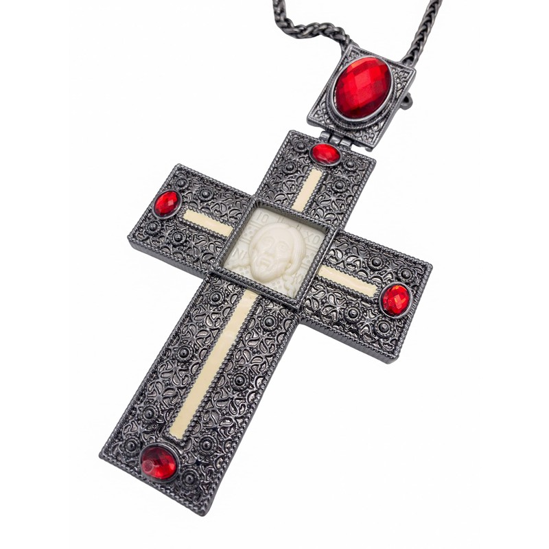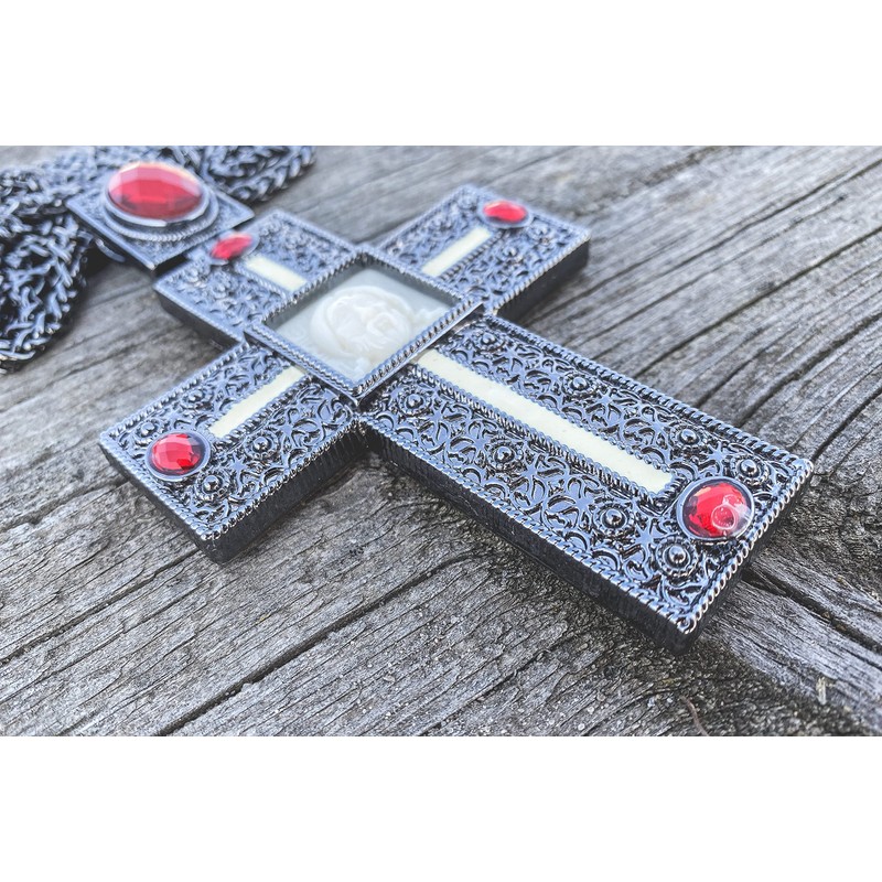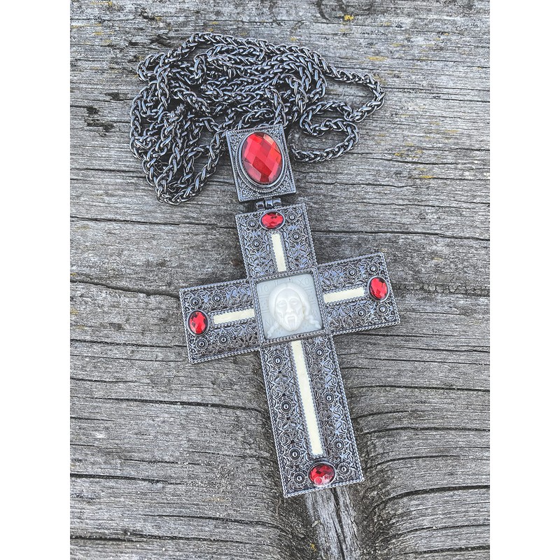 - Oxidized silver plated Clergy pectoral Cross with red crystallized glass elements, acrylic Jesus Christ, and long chain.