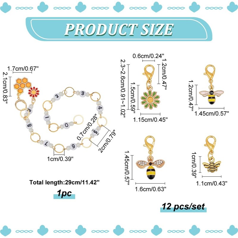 - Value Set -- Contains a daisy and bee knitting row counter chain and 12 pcs stitch markers, size is about counter chain: 29cm long, locking stitch marker: 2.3-2.6cm long, clasp: 1.2x0.6cm, 12pcs
