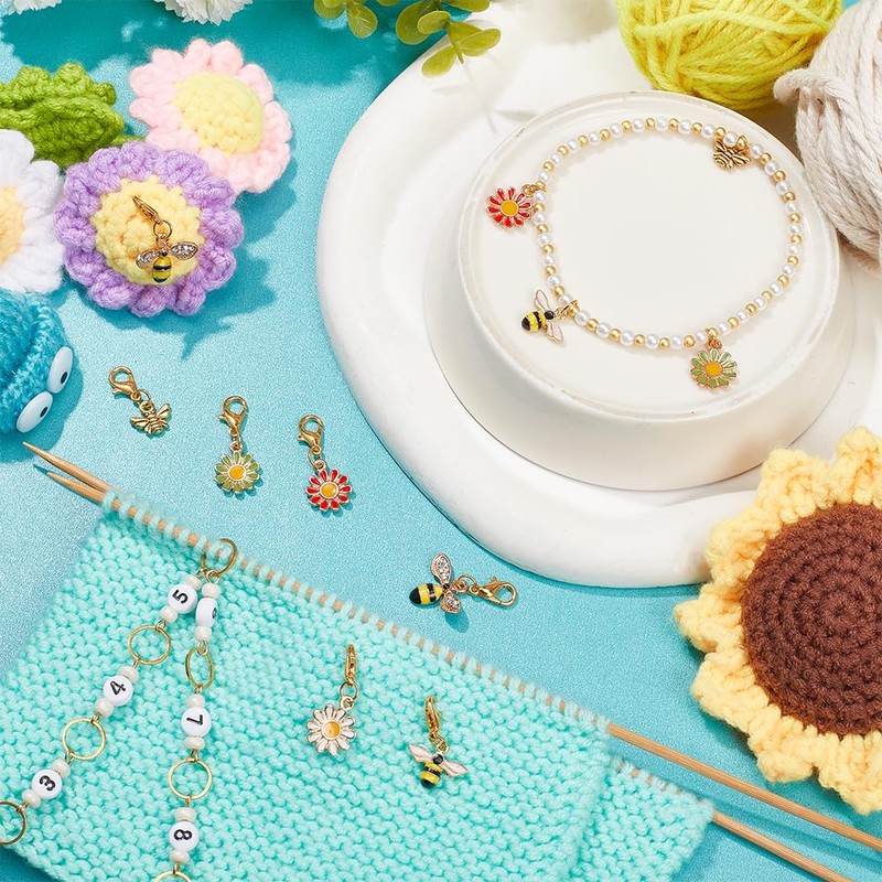 NBEADS 1 Pcs Daisy and Bee Knitting Row Counter Chains and 12 Pcs Stitch Markers, Alloy Enamel Stitch Marker for Knitting Weaving Sewing Jewelry Making Crochet Tracking