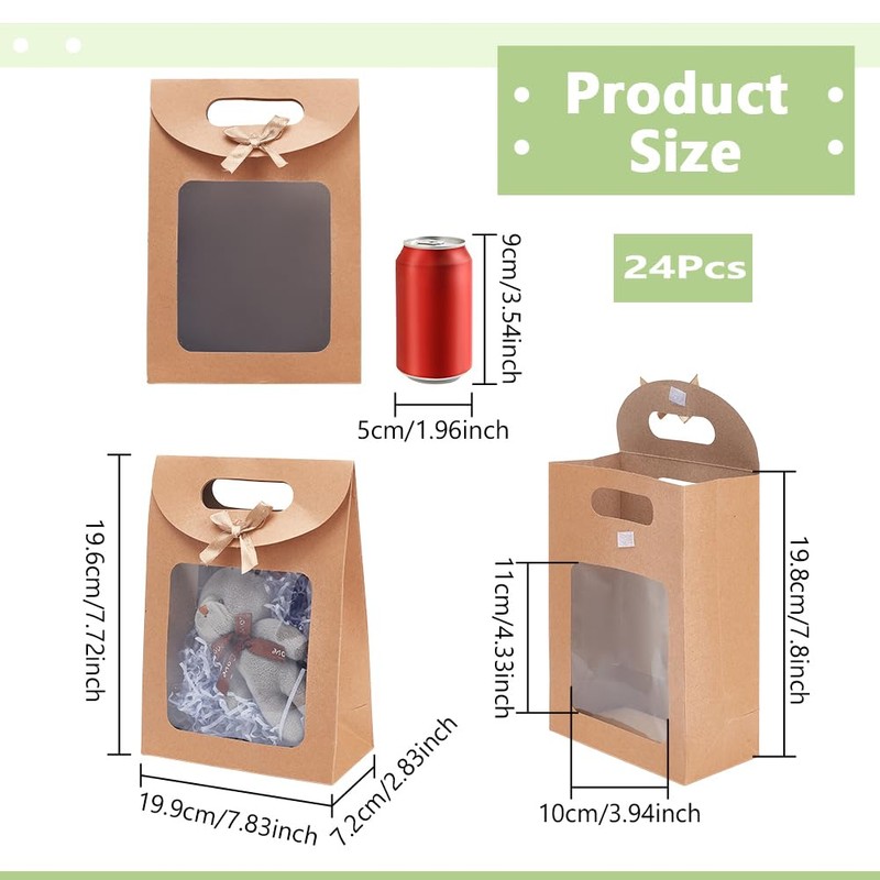 - Quantity and Size: You will receive 24 pcs kraft bags, size is about 7.2cm/2.83 inch wide, 19.9cm/7.83 inch long, 19.6cm/7.72 inch high, unfold: 19.9x14x0.5cm/7.83x5.51x0.20 inch, window: 11x10cm/4.33x3.94 inch, enough quantity for you to meet your daily needs