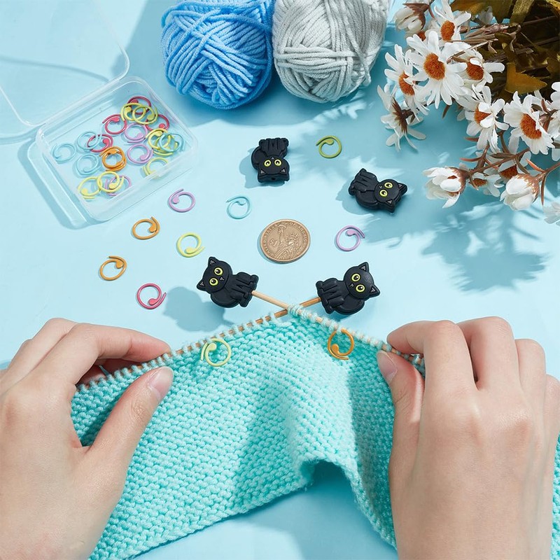 NBEADS 4 Pcs Knitting Needle Stoppers, 30 Pcs Knitting Stitch Marker Rings Cat Needle Point Protectors with a Storage Box Knitting Supplies Accessories for DIY and Handmade Crafts