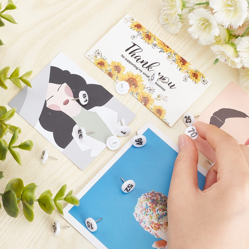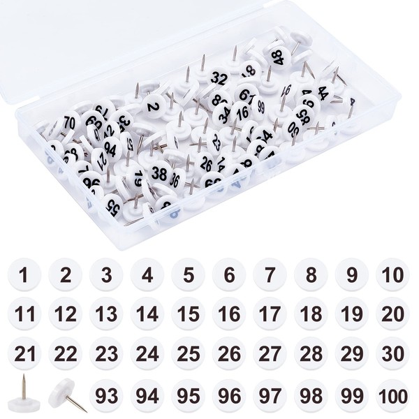NBEADS Pack of 100 Numbered Thumbtacks, White Base, Black Numbers, 1-100 Pins, Plastic Drawing Pins for Cards, Presentations, Photos, Poster, Exhibition, 16 x 11 mm