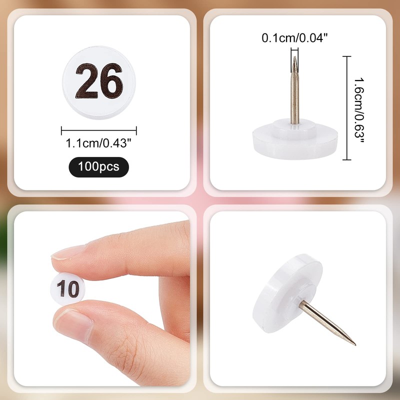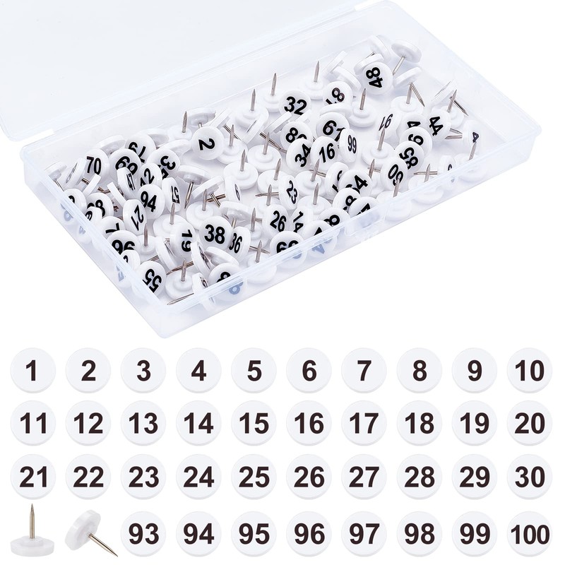 - 100 Consecutive Numbers - White flat pins are printed with black numbers, high contrast and easy to mark, numbers from 1 to 100, enough for your daily needs. The size of the pin is about 11mm in diameter, 16mm long, pin: 1mm.