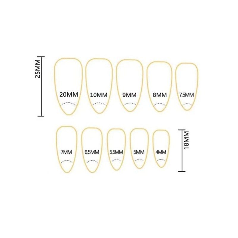 • Package About:Blue french tip false nails.The package contains 24 Pieces of medium almond press on nails of different sizes,1 adhesive tabs,1 small wooden stick,and 24 pieces nail glue stickers.You can safely choose a fake nail that fits your finger size