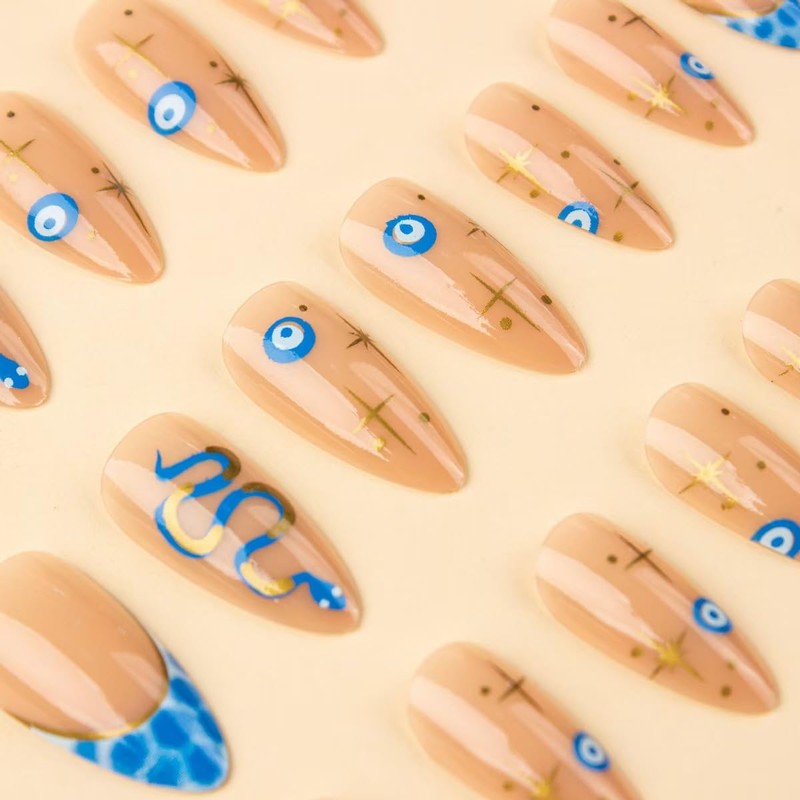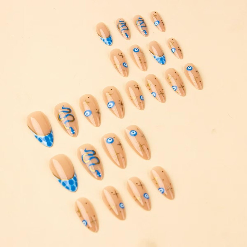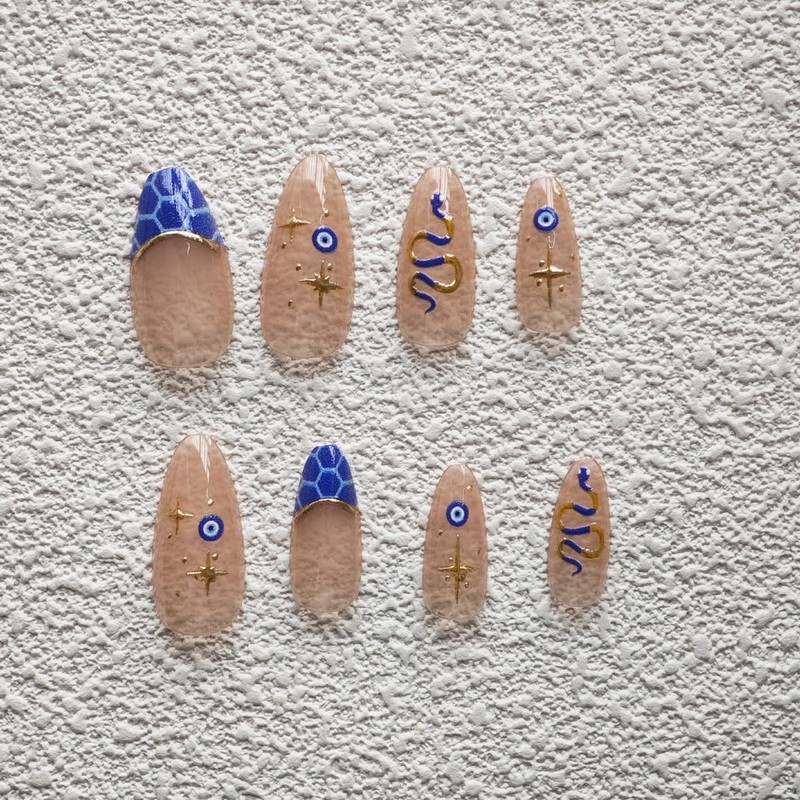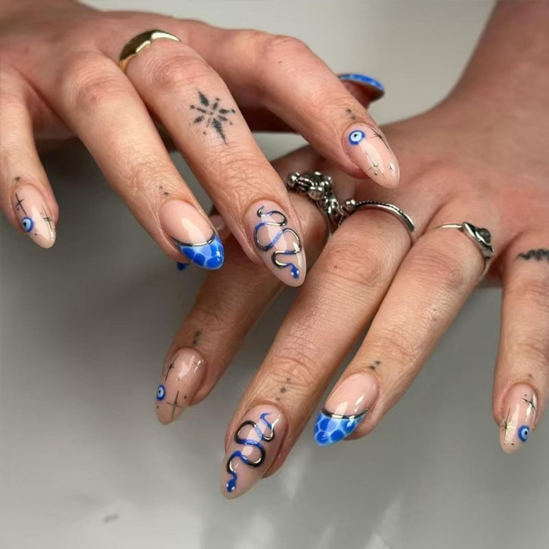 NBNTGH Snake Press On Nails - Medium Almond Blue French Tip False Nails with ...