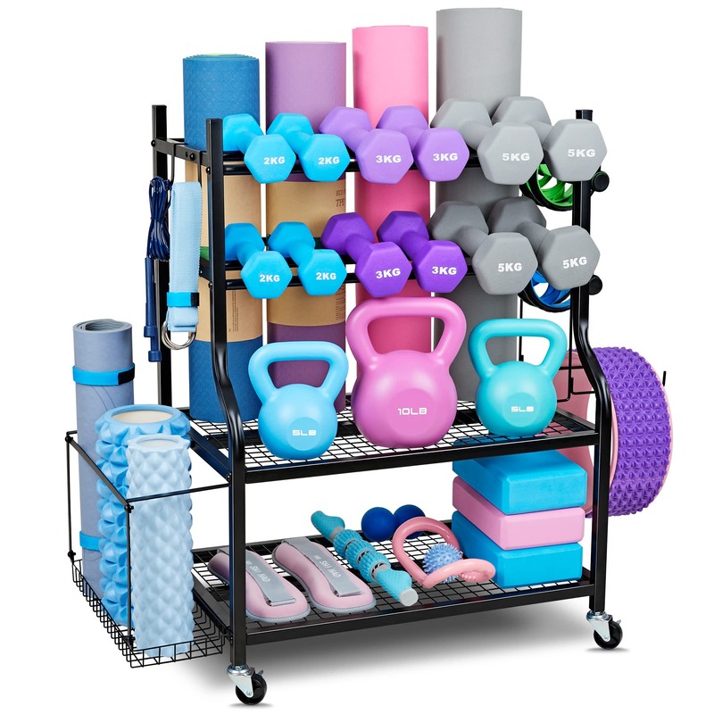 - 【4 CASTER WHEELS】- The fitness equipment organizer rack equips with 4 strong 360-degree caster wheels (2 lockable). Convenient to move this storage cart to any place you want. Ideal to use in the Garage, Home and Gym.