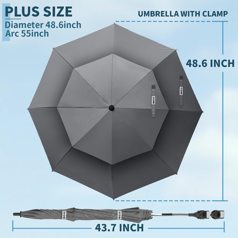 - 2 PACK PLUS SIZE SUNSHADE UMBRELLA: This clip-on umbrella with a curvature of 54.7 inches ARC and a diameter of 48.6 inches is an excellent choice for beach chairs.This plus size adjustable umbrella can accommodate two adult people instead of a single people. This 2pcs clamp with umbrella for beach chair is very suitable for families, friends, and couples to travel. We also come equipped with packaging bags. This big umbrella for 2 people allows you to easily carry a parasol to the beach trips, picnics, or camping adventures, allowing you to enjoy shade and comfort on the go without feeling weighed down
