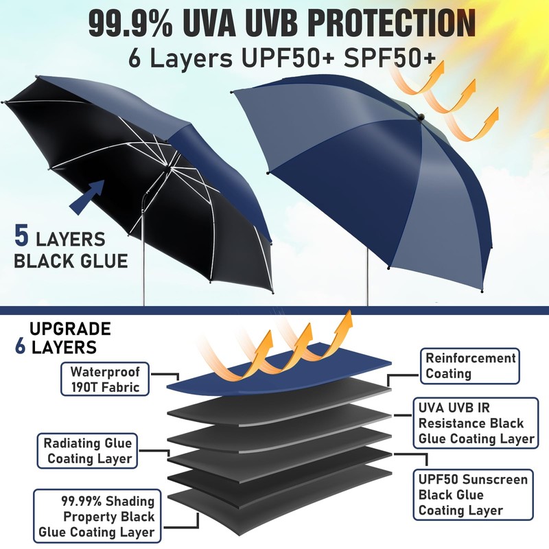 - High-Level UPF 50+ Sun Protection:This umbrella for beach chair constructed with 210T waterproof fabric and this golf cart umbrella has 5 layers black glue coating. This chair umbrella with clamp adjustable effectively blocking 99.99% of UVA and UVB rays, and this wheelchair umbrella is offering UPF 50+ UV protection. This clamp umbrella for beach chair providing exceptional sun ray defense