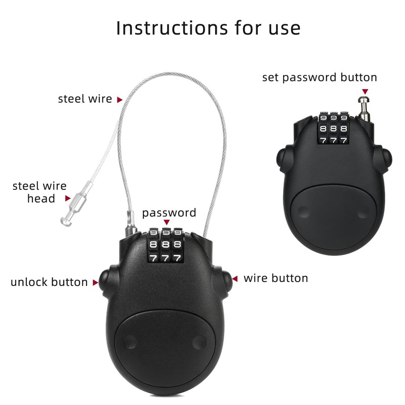 • The NBYT Luggage Locks are a reliable and versatile travel accessory that boasts a combination lock and retractable cable design. Ideal for use with multiple travel cases, luggage, backpacks, strollers, and cycling helmets, this small bike lock is durable and lightweight, providing superior protection for your valuables.